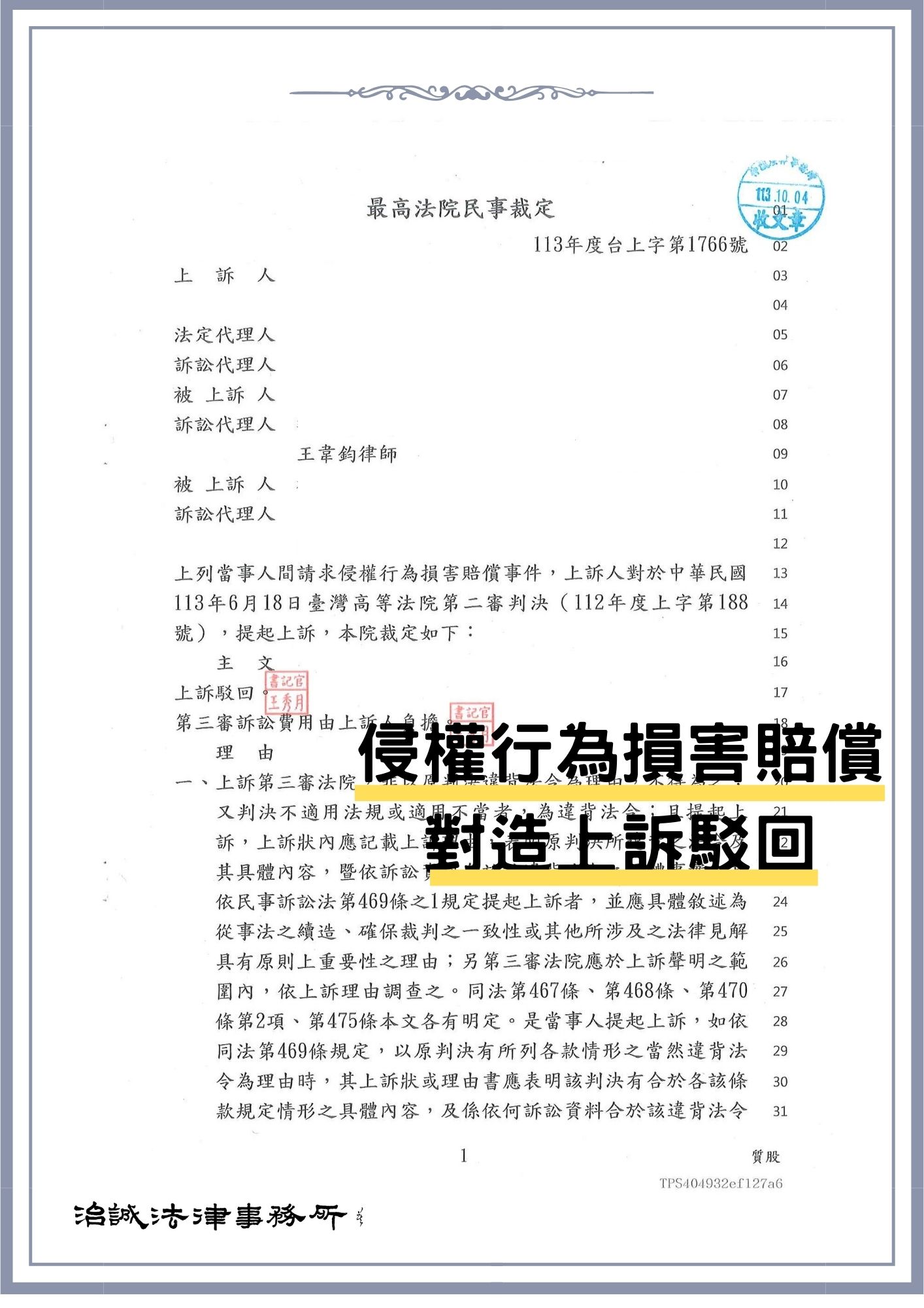 我方侵權行為案件二審勝訴,對方不服上訴,最高法院仍維持判原判