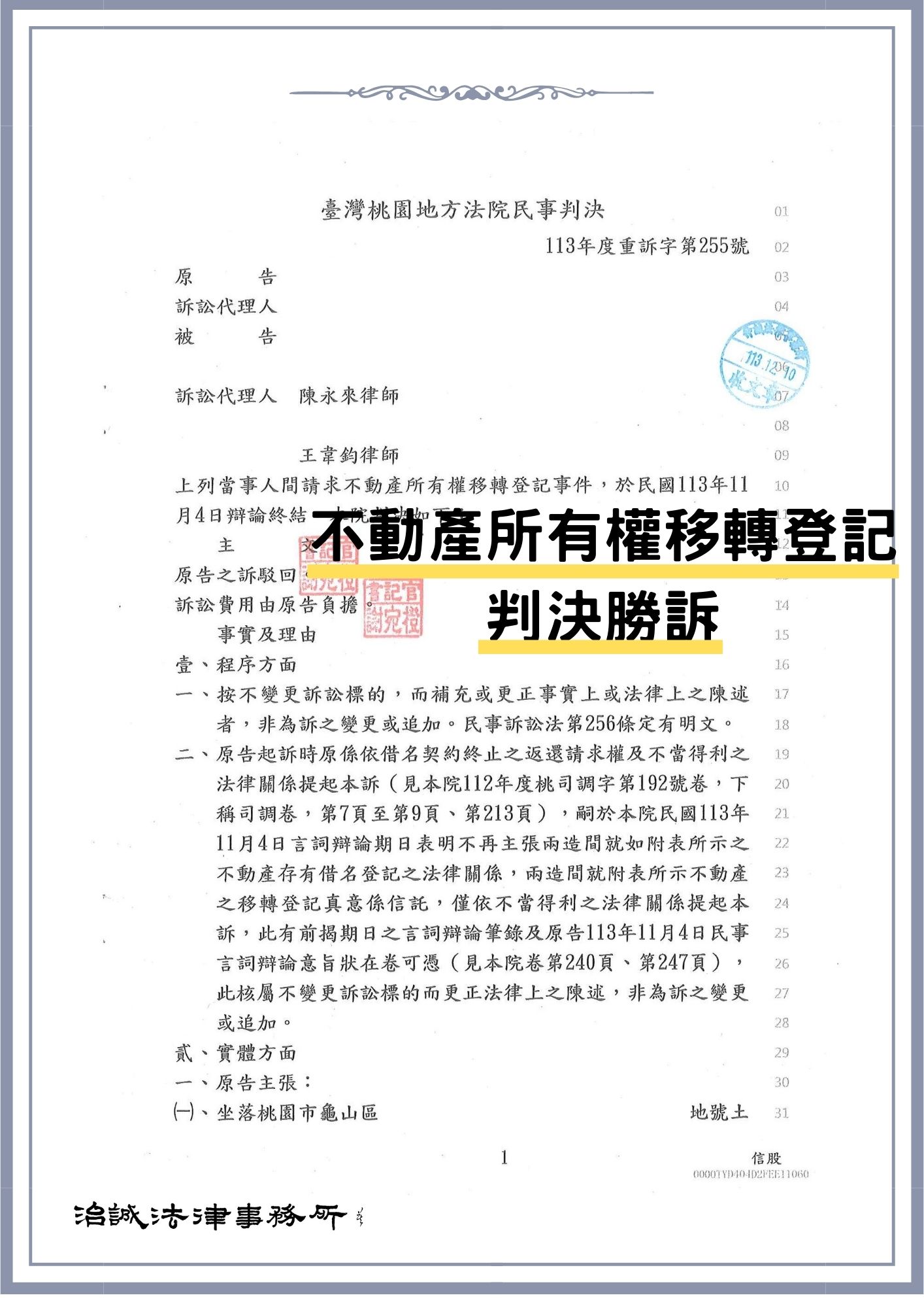 不動產所有權移轉登記案件:勝訴判決-113重訴255 | 治誠法律事務所