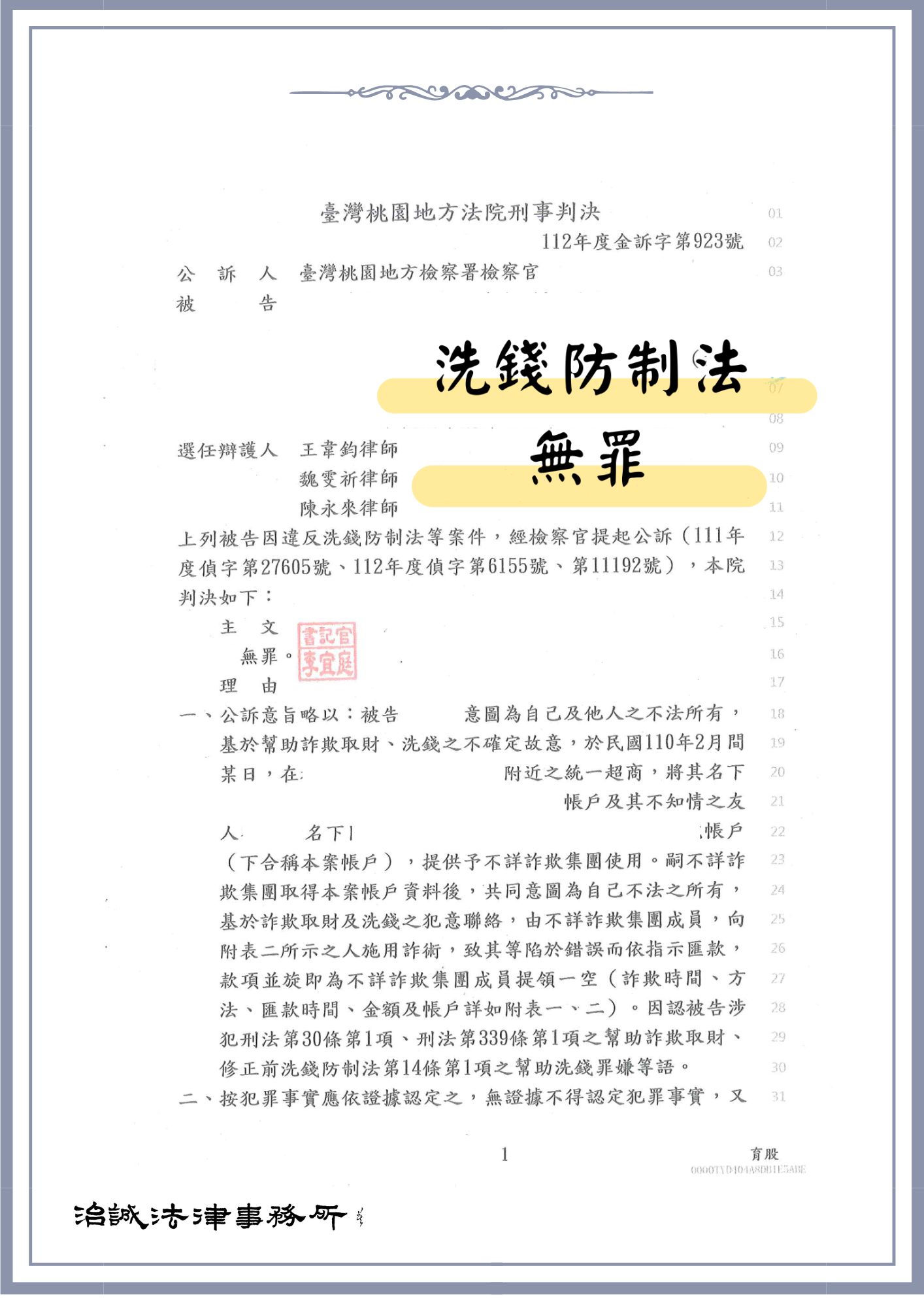 - 既然連「主犯是否成立詐欺罪」都有重大疑問,就更不可能認定有特定犯罪所得,也就**談不上幫助洗錢或幫助詐欺**,最後判決被告無罪。