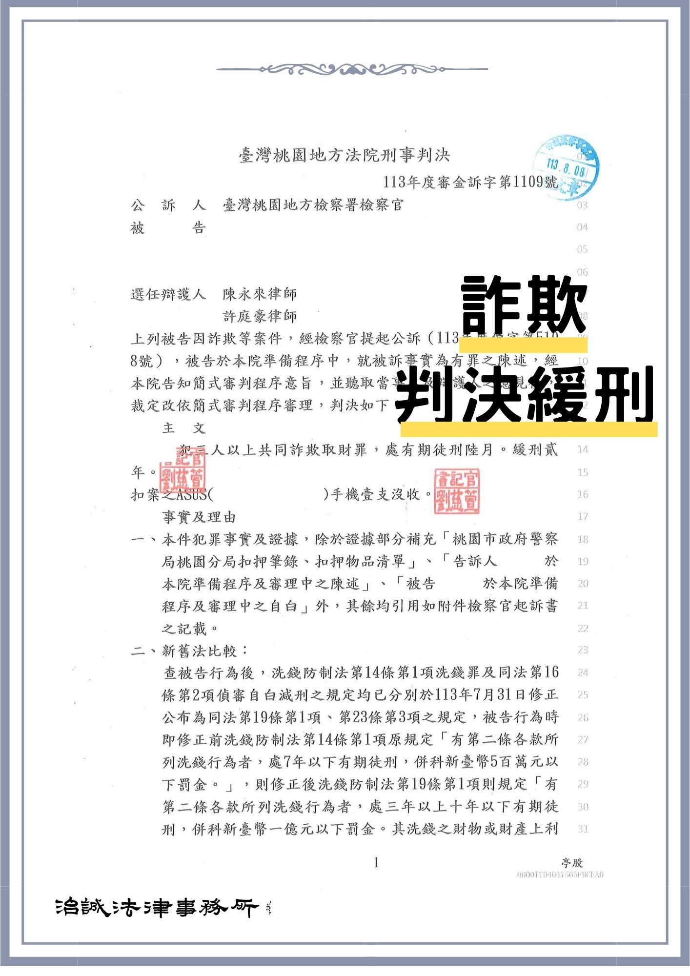經本所律師團隊評估案情並與當事人溝通後,決定採取認罪之答辯並與被害人達成和解,爭取洗錢防制法自白減刑規定之適用並從輕量刑。經律師強調本案當事人年紀尚輕思慮不周而誤觸法網;於本案中屬於犯罪末端之邊緣角色,且於本案前並無任何前科;並透過律師與被害人協商達成和解,使被害人於審理過程中向法院表示願給予被告改過自新的機會。最終替當事人爭取到緩刑之機會。