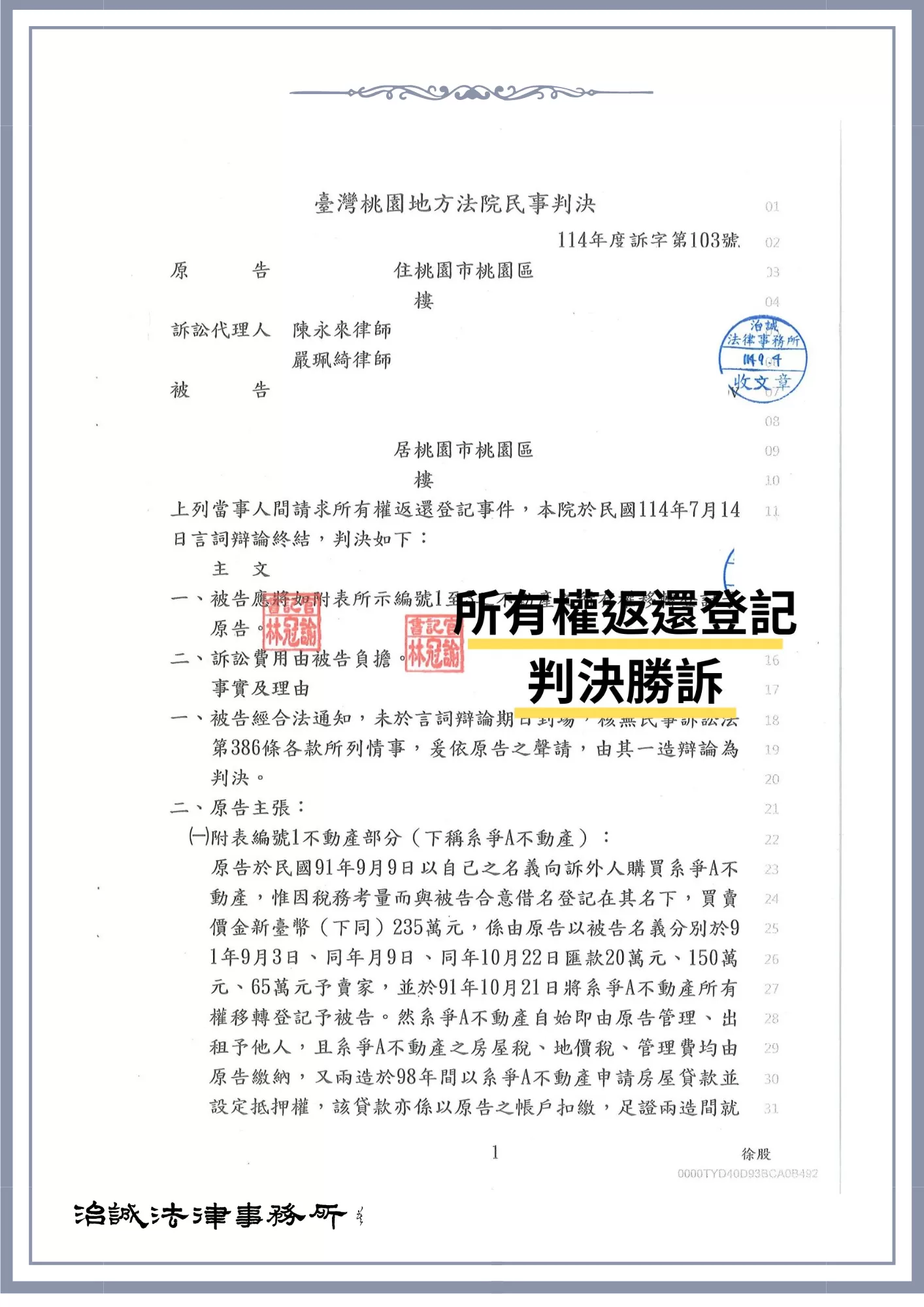 所有權返還登記:一審勝訴-114訴103 | 治誠法律事務所