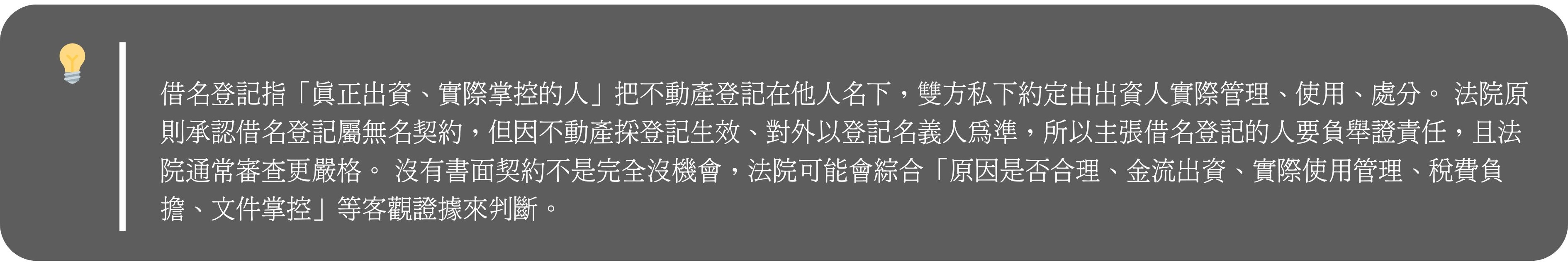• 如果沒有書面,法院會看其他事實能否合理推認「你們就是約定借名」