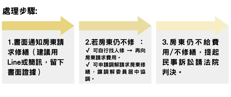 ✔ 可申請調解請求房東修繕,讓調解委員居中協調。