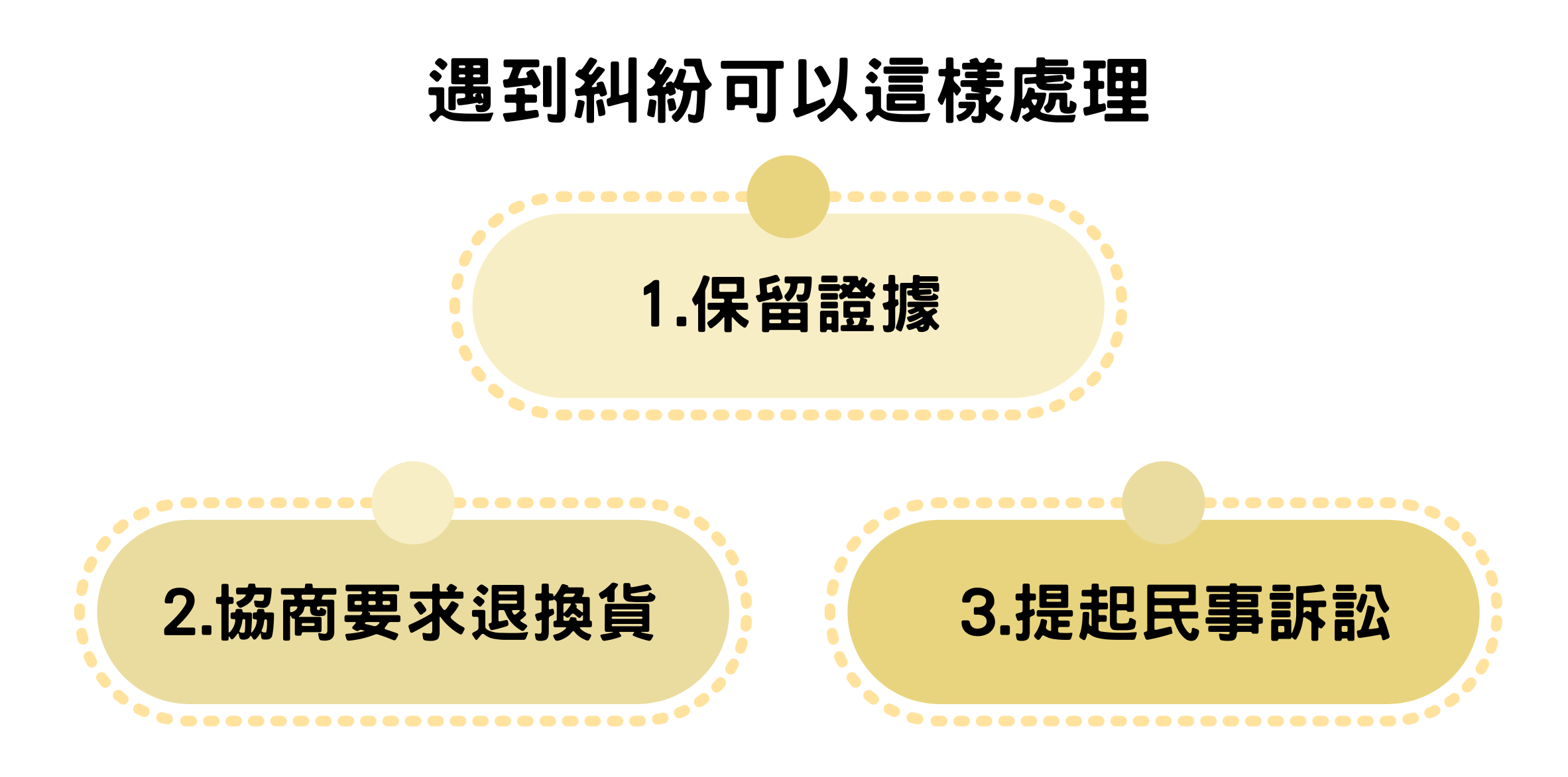 2️⃣ 先與對方協商要求退貨或換貨,可申請調解請調解委員會居中協調。